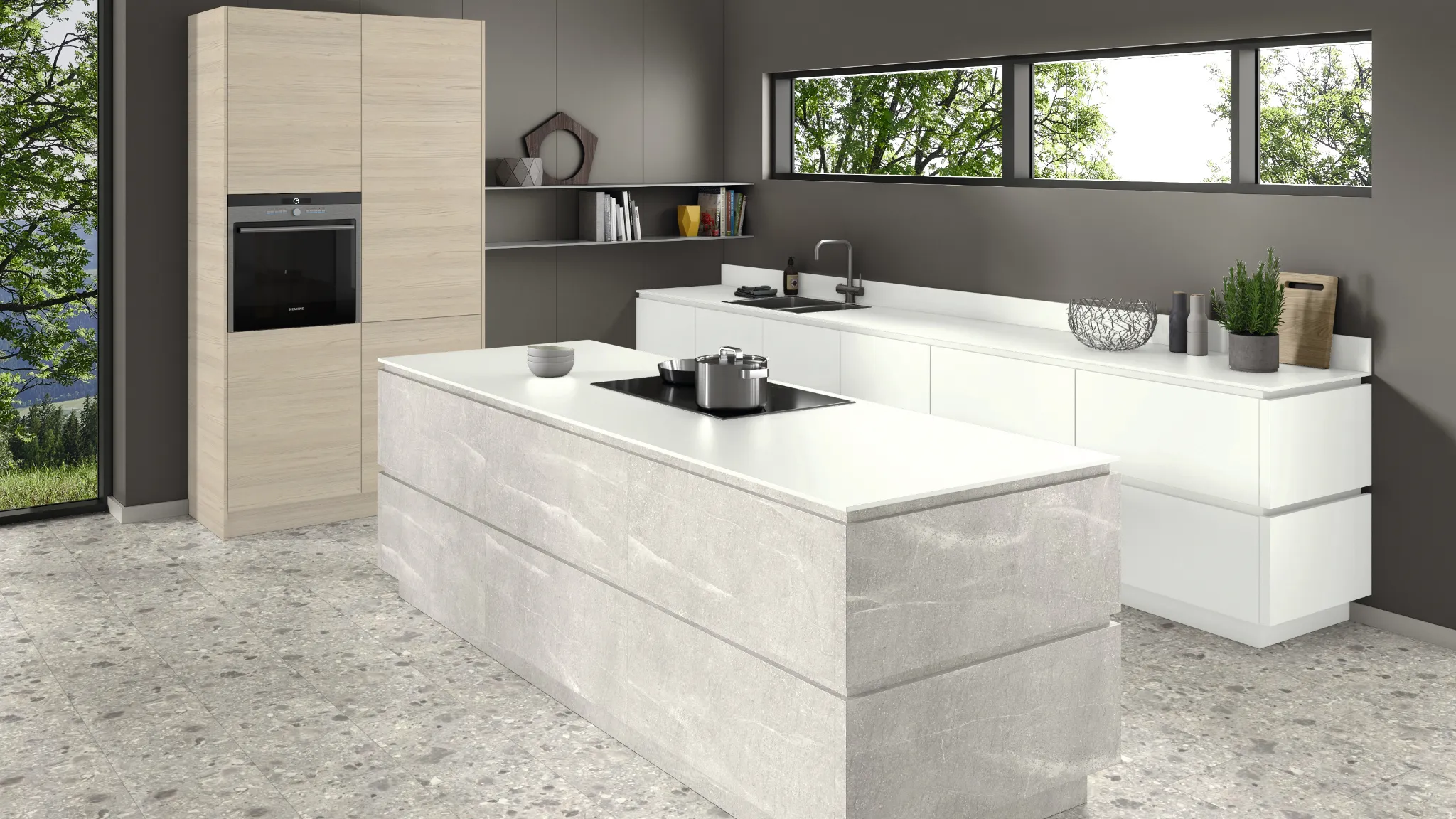 Το σχέδιο F243 Light Grey Candela Marble μοιάζει με ένα μείγμα μάρμαρου και τσιμέντου, αλλά παρουσιάζει στοιχεία μιας εκλεπτυσμένης πέτρας. Αυτή η ποικιλία στον χαρακτήρα αναδεικνύεται ιδιαίτερα καλά σε μεγάλες επιφάνειες. Αυτό υποστηρίζεται από την επανάληψη XL, η οποία ελαχιστοποιεί τις επαναλήψεις στην εικόνα του σχεδίου. Οι συνδυασμοί με ζεστά, ουδέτερα μονόχρωμα ή ξύλινα σχέδια ταιριάζουν απόλυτα με τις νευρώσεις θερμών τόνων. Η υφή επιφάνειας ST76 Mineral Rough Matt υποστηρίζει αυτή τη φυσική όψη με μια ματ-τραχιά αίσθηση.