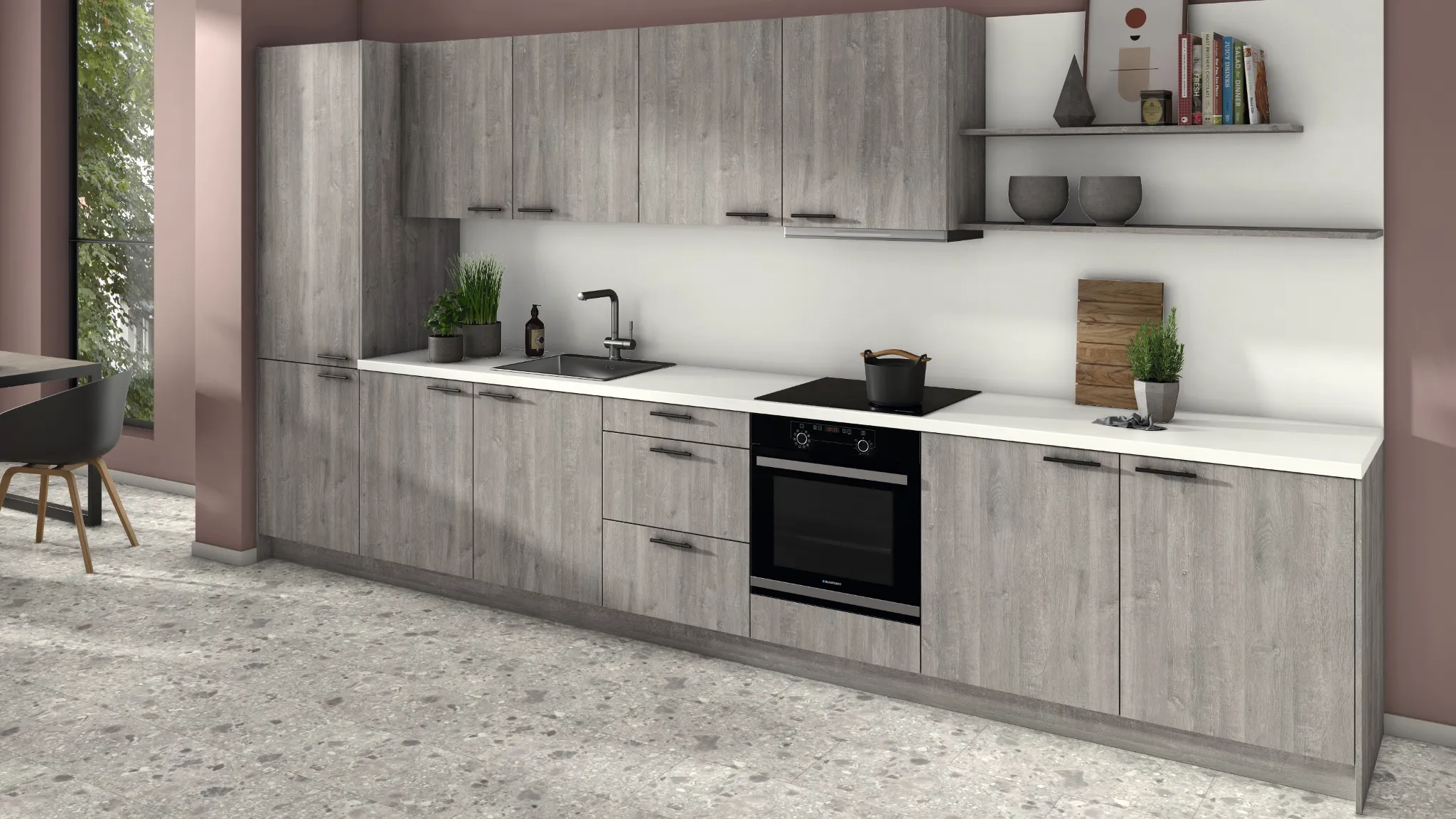 Το μεσαίου τόνου γκρι σχέδιο U763 Pearl Grey είναι ιδιαίτερα κατάλληλος για σχέδια ξύλου με λίγο γκρι περιεχόμενο. Το ψυχρό γκρι έχει ποικίλες χρήσεις χάρη στην ουδετερότητά του και παρέχει συνοχή στο σχεδιασμό. Η υφή επιφάνειας ST76 Mineral Rough Matt δημιουργεί μια τραχιά όψη πέτρας, η οποία δεν είναι τόσο κυρίαρχη οπτικά και δημιουργεί μια κομψή υφή όχι μόνο στους πάγκους.